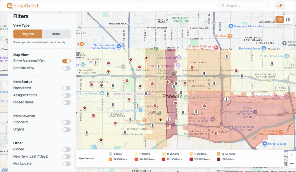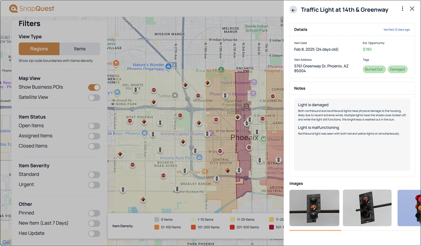 With SnapQuest, government teams gain instant visibility into issues the moment they’re captured in the field. Whether it’s a damaged road sign, a pothole, or a malfunctioning streetlight, every report is uploaded in real time with photos, location details, and condition notes.